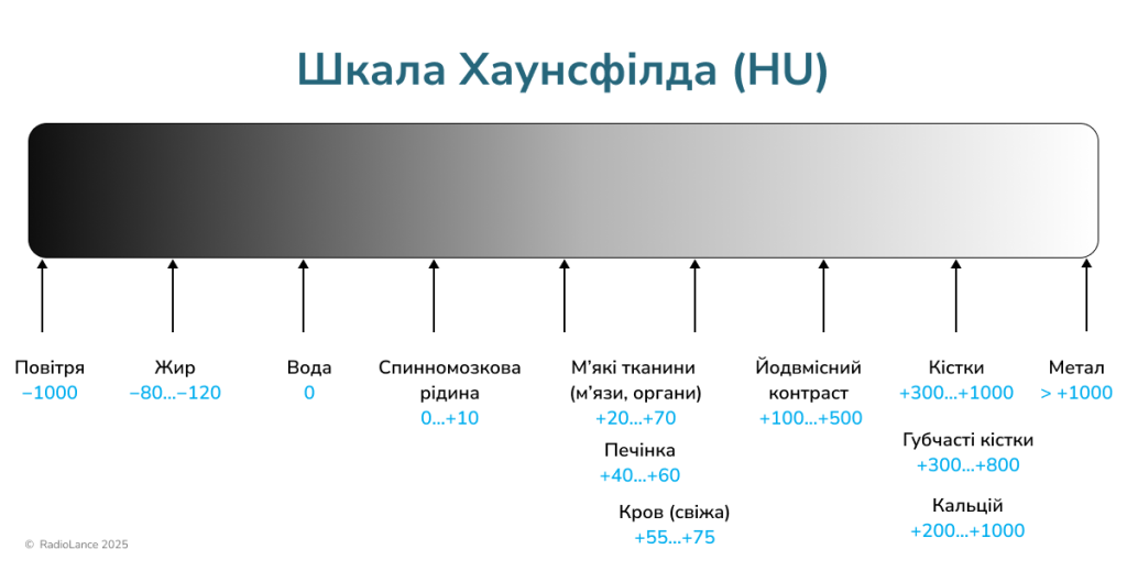 На КТ щільність різних тканин вимірюється в одиницях Хаунсфілда (Hounsfield Units, HU). Це спеціальна шкала, яка показує, наскільки щільною є структура на зображенні.